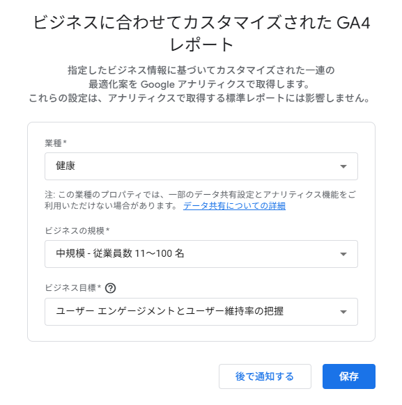 業種や企業規模などの情報を入力し、最後に「作成」ボタンをクリックすれば、基本的なアカウントとプロパティの作成は完了です。