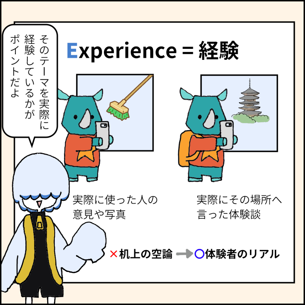 Experience(経験)は、コンテンツの作成者がそのトピックについて実際に経験しているかどうかを問います。たとえば、製品レビューを書く人が実際にその製品を使用したことがあるか。旅行ガイドを書く人が実際にその場所を訪れたことがあるか。机上の知識ではなく、実体験に基づいた情報かどうかが評価されます。