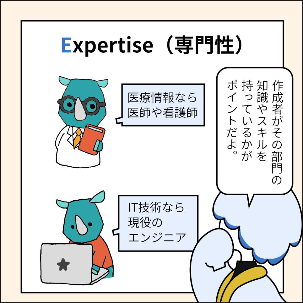 Expertise(専門性)は、コンテンツの作成者がそのトピックについて必要な知識や技術を持っているかどうかを指します。医療情報であれば医療従事者、法律情報であれば弁護士といった、その分野の専門家による発信が高く評価されます。