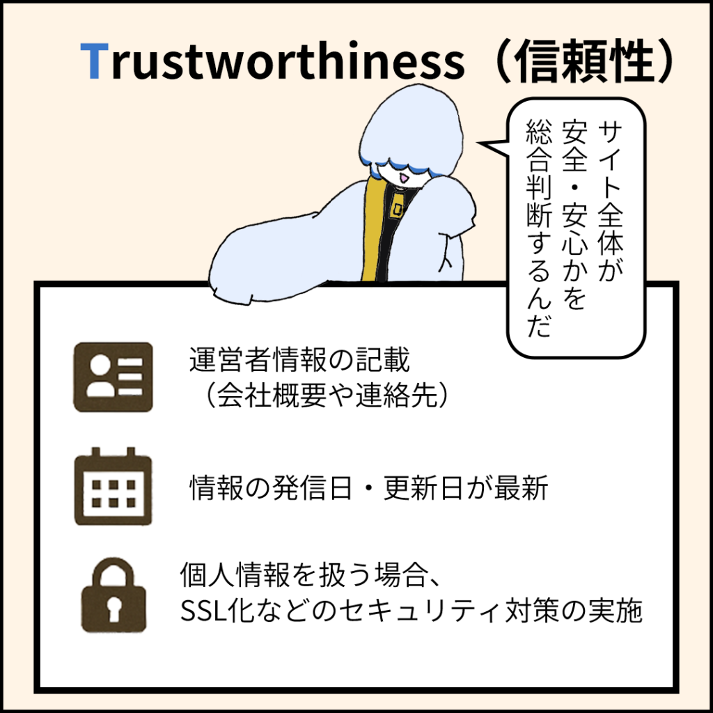 E=Experience(経験), E=Expertise(専門性), A=Authoritativeness(権威性), T=Trustworthiness(信頼性)っていう風にね