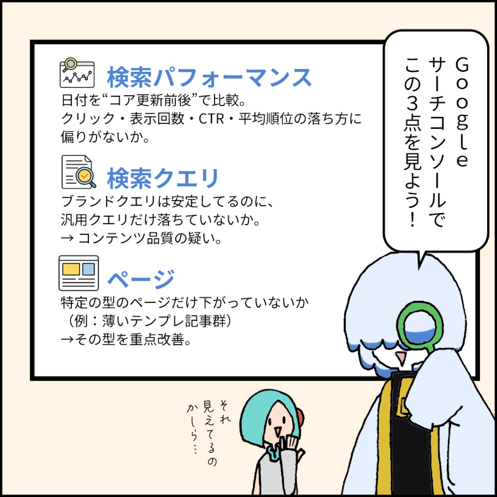 特にCTR(クリック率)や平均順位の落ち方を見れば、“検索結果のどの層”から評価が変わったのかが分かるよ