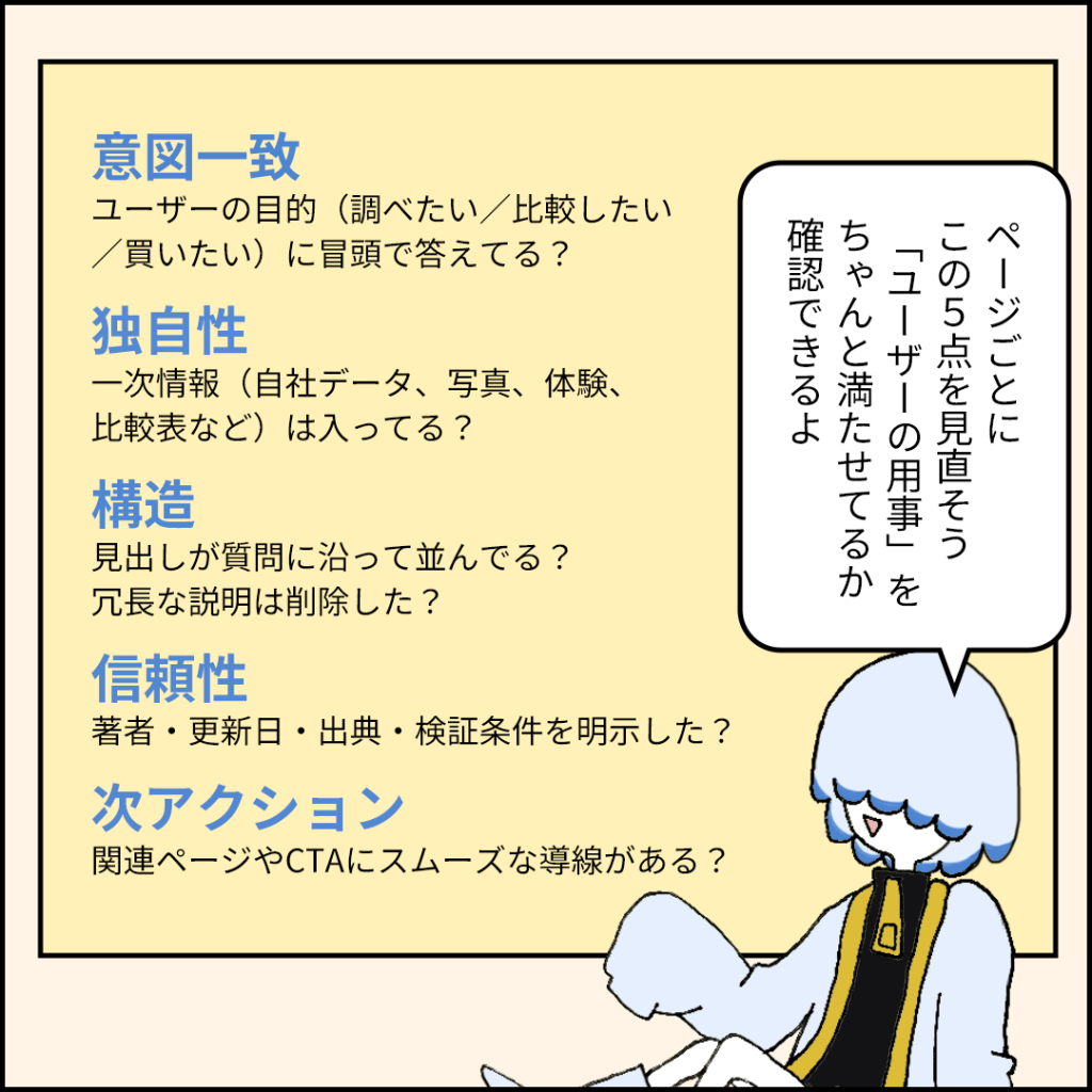 つまりこのアップデート以降、Googleは“小手先のテクニック”よりも「ユーザーに本当に役立つコンテンツ」を評価するようになったんだ