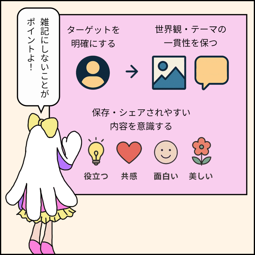 特に重要なのは、アカウント全体の「世界観」を統一することです。フィードを訪れたユーザーが、一貫したテーマや価値観を感じ取れるようにする。それが、「この人の投稿をもっと見たい」という気持ちを生み、フォローやいいねにつながっていきます。