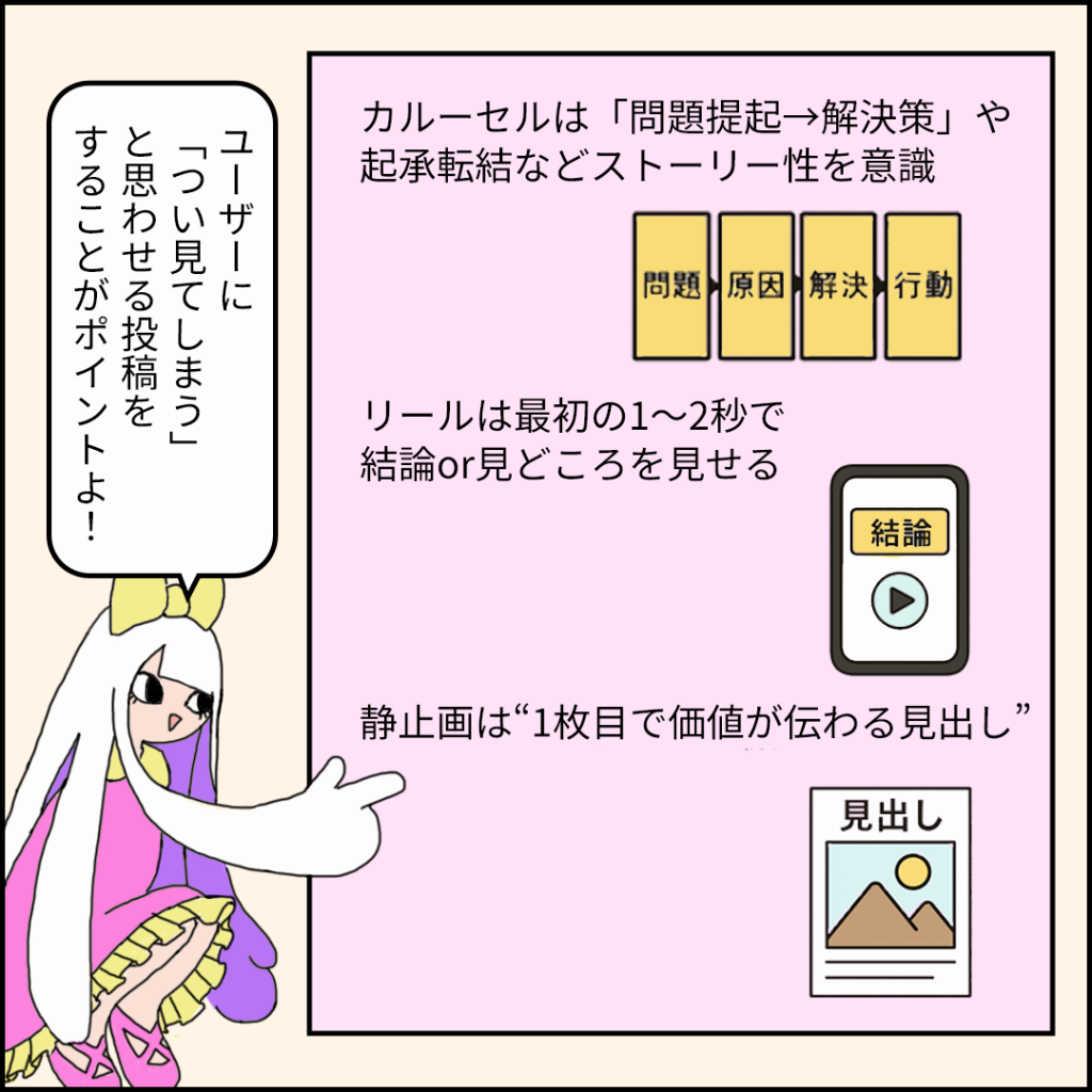 大切なのは、フィードに流れてきたとき、スクロールを止めてもらえるかどうか。一枚目の画像で「おっ」と思わせられるかどうか。その一瞬の引力が、いいねにつながる第一歩です。