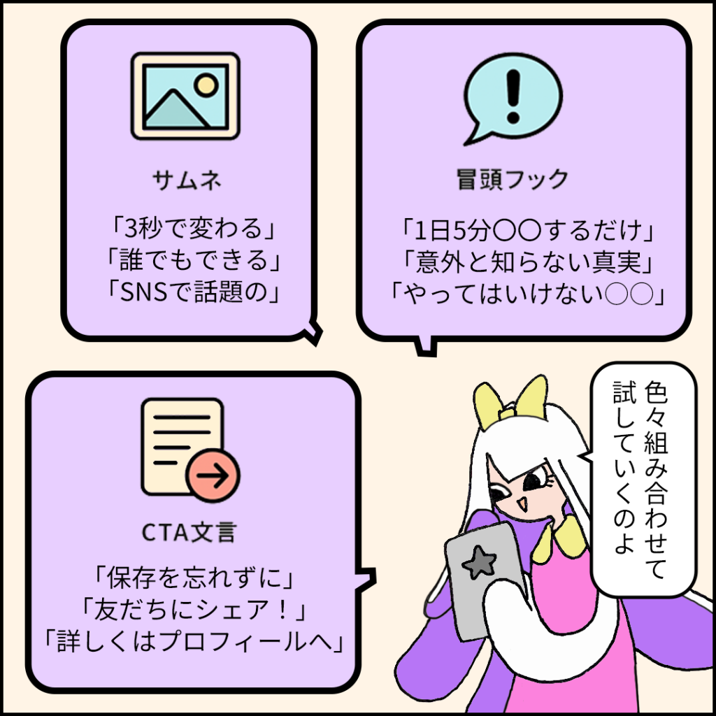 サムネ3種、冒頭フック3種、CTA文言3種のミニABテストを回すといいよ