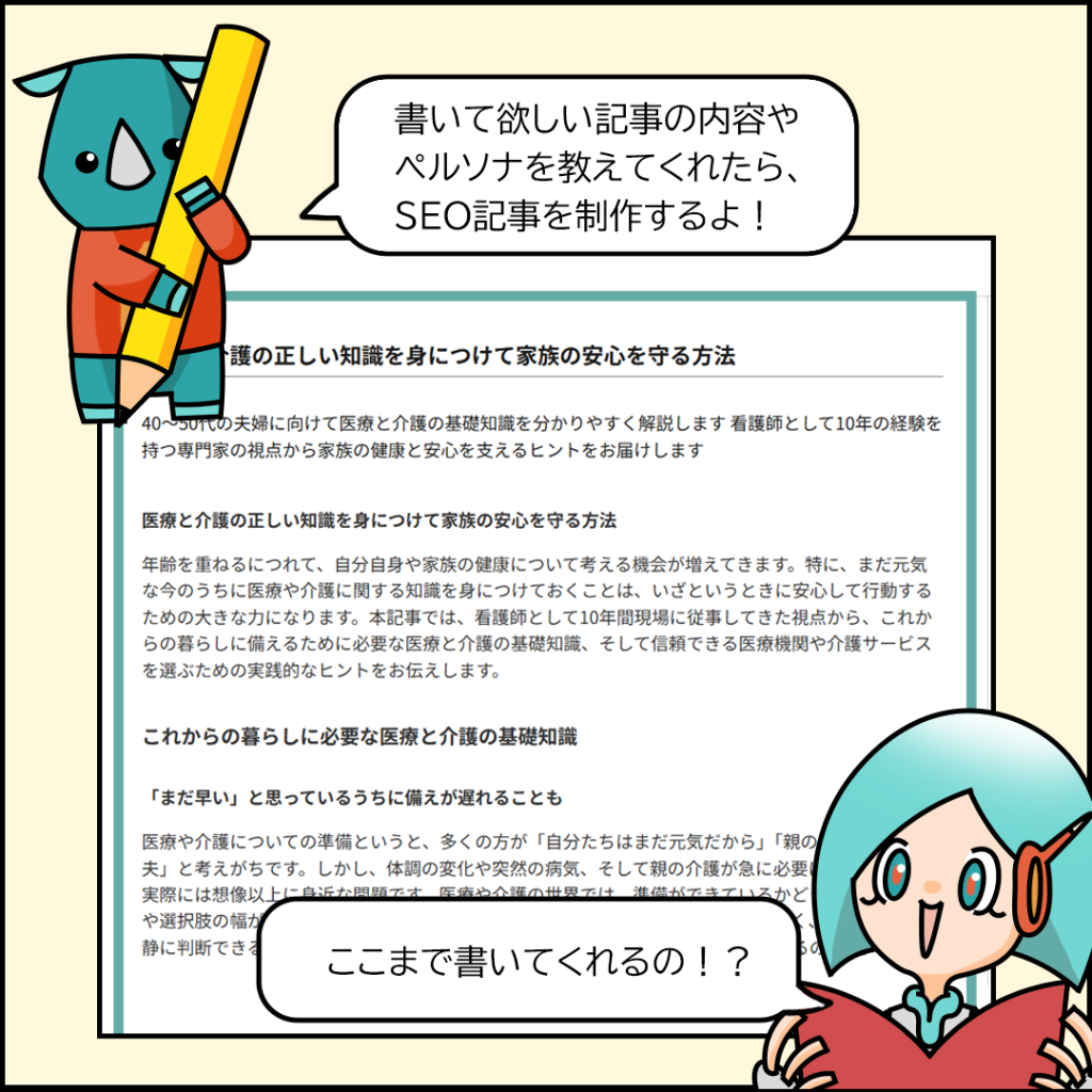 お客様に『これ書いて!』って言われたら、関連の上位記事をぜんぶ調べて分析して、“読者が本当に求めてる内容”を書くんだよ。
