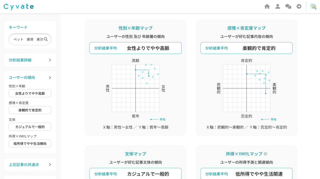 AIのNLP分析により、ユーザーの興味関心を分類し、「〇〇というカテゴリーに興味があるユーザーはこのページを見てからお問い合わせをしている」などの興味関心を基軸としてユーザー行動を可視化しています。