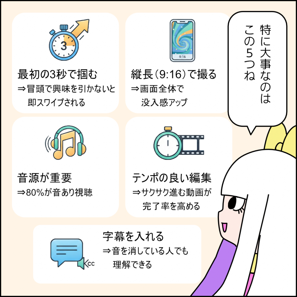 短尺動画の特性上、構成の工夫が成果を大きく左右します。「最初の3秒で引きつける」ことはリール戦略の基本ですが、それを実現するためには導入部分にインパクトのあるビジュアルや問いかけを配置する必要があります。例えば「あなたのSNS戦略、間違っていませんか?」というような挑戦的な言葉は、スクロールを止める効果が高いとされています。