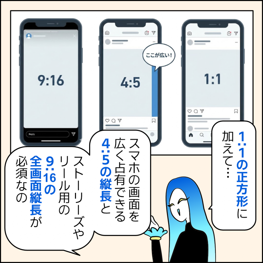 特に4:5はタイムラインで大きく表示されるから、目に留まる確率がぐんと上がるよ