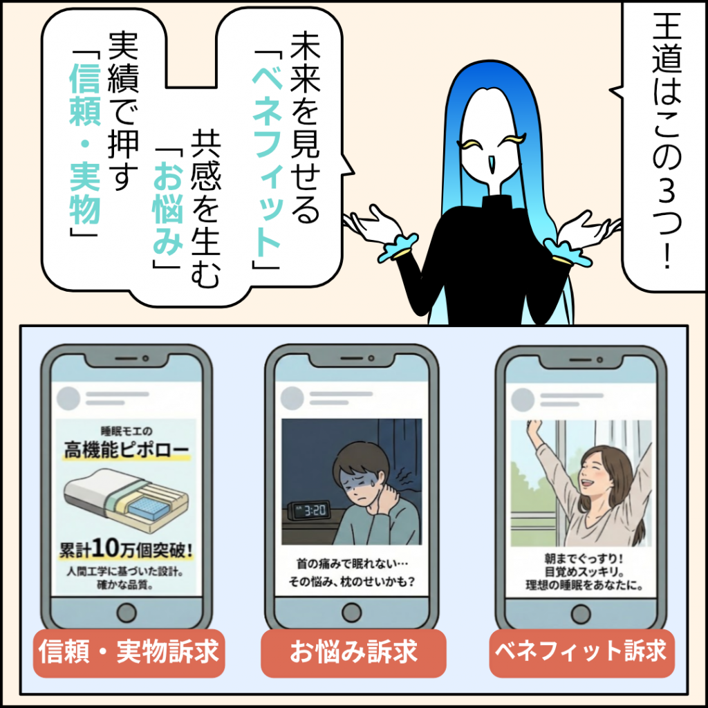 そう、この全く違う3種類を同時に走らせることで、AIが「このユーザーにはお悩み系だな」と判断して、最適な人に最適な画像を届けてくれるようになるんだ