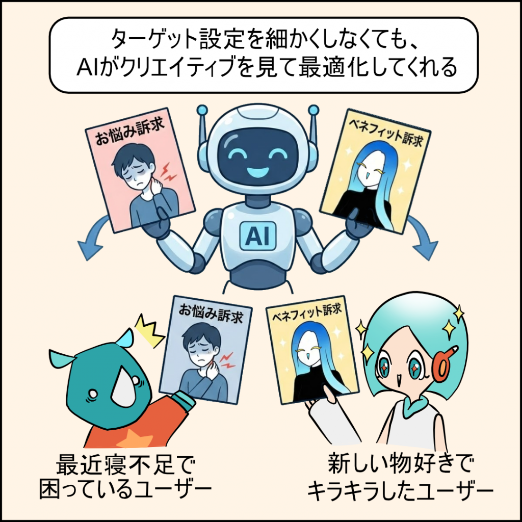 AIが「誰にどの広告を渡すか」を選びやすいように、私たちがバリエーションをもたせることが大事なんだね!
