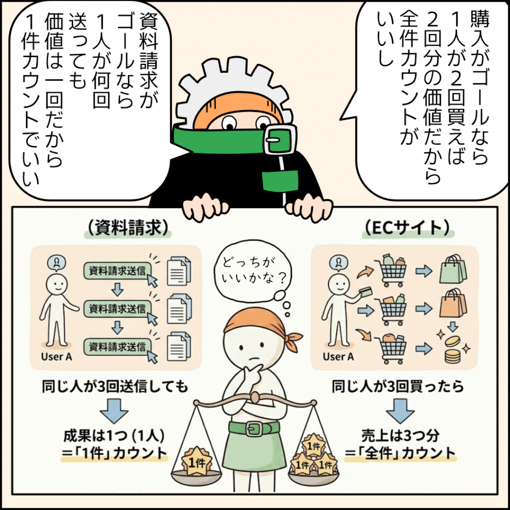 一方で「全件(すべて)」という数え方は、商品購入のように、行動の回数がそのまま売上に直結するケースに適しています。たとえば、同じユーザーが1ヶ月の間に2回購入してくれた場合、企業にとっては2回分の売上が発生しています。このような行動を「1件だけ」として扱ってしまうと、実際の売上を正しく反映できません。そのため、購入のように回数が価値に直結する行動は「全件」でカウントすることが適切です。