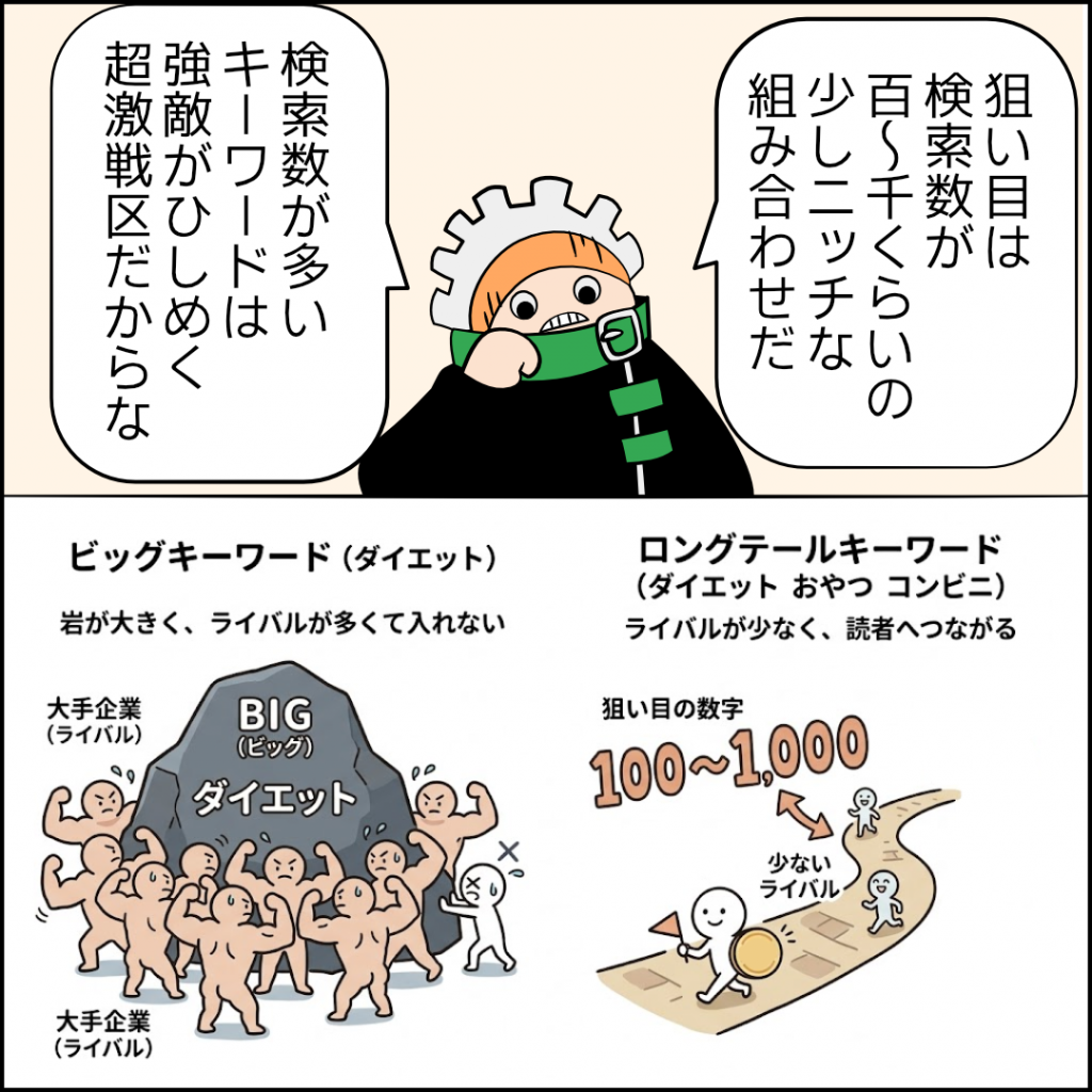 こうした複合キーワードは、「ロングテールキーワード」と呼ばれます。ロングテールキーワードは、一つひとつの検索ボリュームはそれほど大きくないものの、競合が少なく、上位表示しやすいという特徴があります。初心者の方が最初に狙うべきなのは、まさにこのロングテールキーワードです。ロングテールキーワードで書いた記事がいくつも積み重なっていくと、サイト全体としてのアクセスがじわじわと増えていきます。最初は小さな積み重ねに見えるかもしれませんが、長期的に見ると非常に大きな差になります。