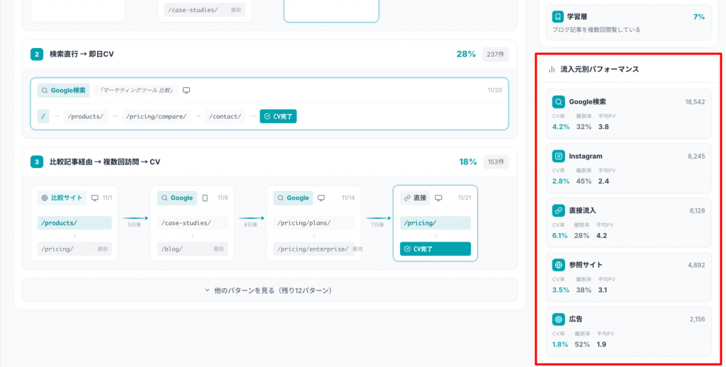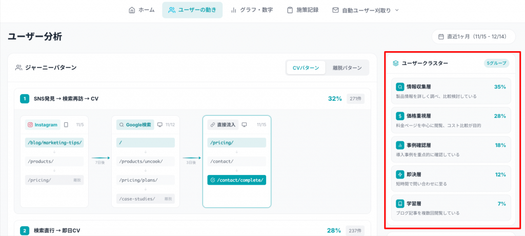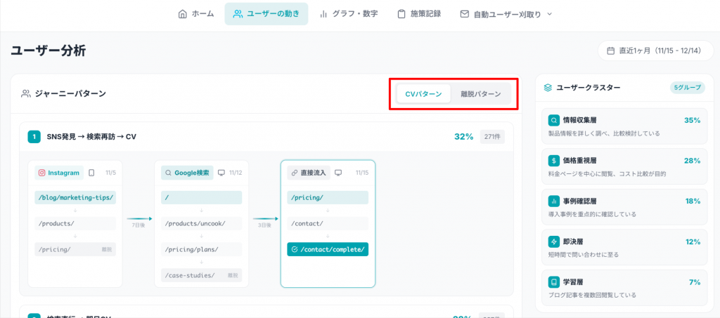 管理画面では「ジャーニーパターン」「ユーザークラスター」「流入元別パフォーマンス」の3つがあります。