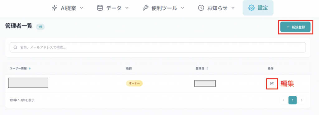 右上の「+新規登録」にてユーザーの追加、もしくは各ユーザーの「編集」ボタンよりユーザの情報を編集いただけます。