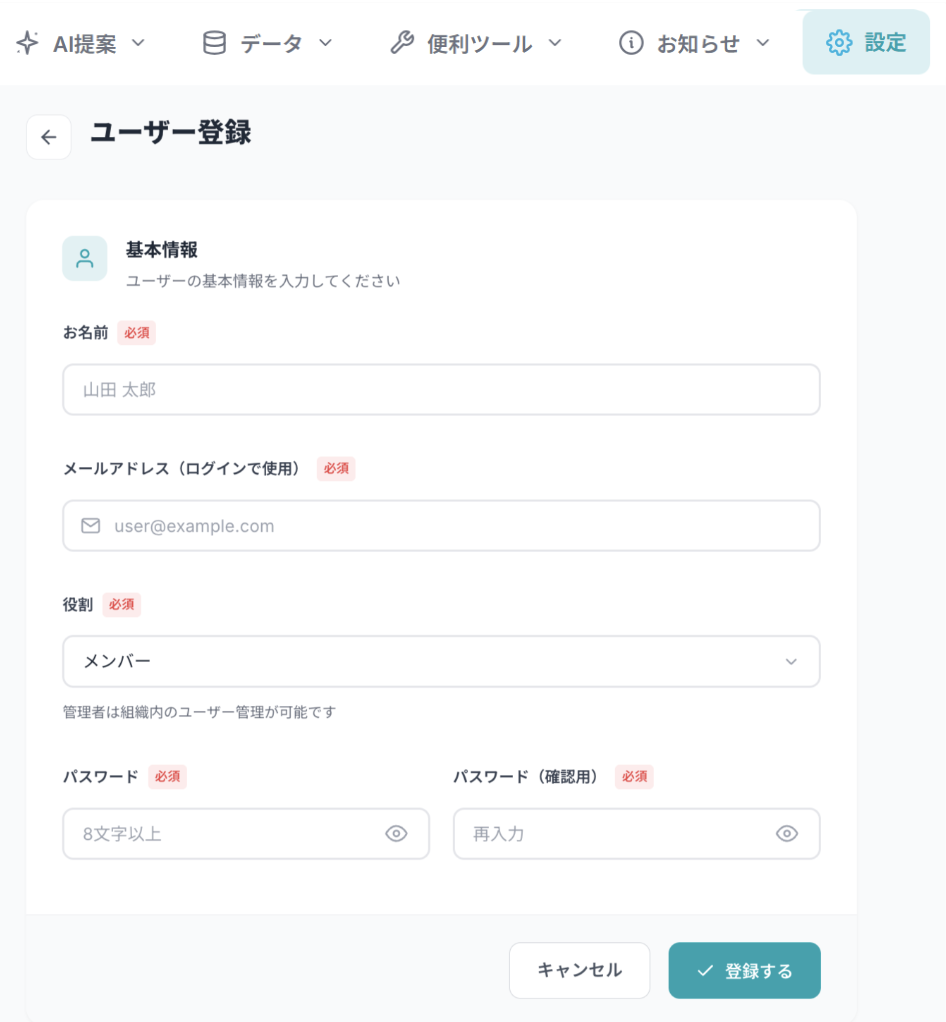 新しくユーザーを追加する場合、右上の「+新規登録」ボタンをクリックしてください。