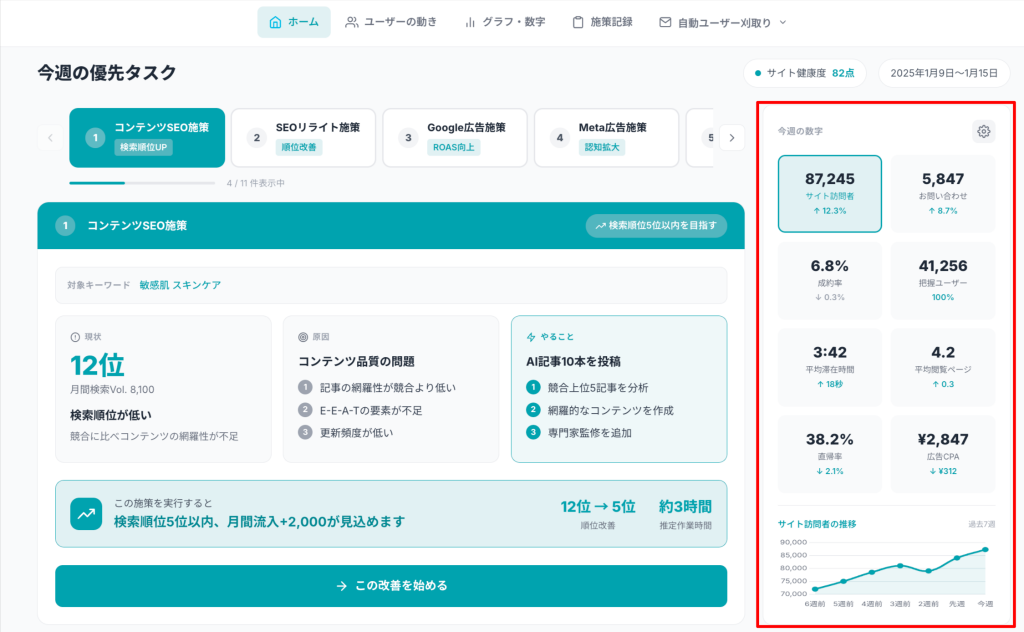 「直近の課題」では、AIが分析した優先度の高いマーケティング施策がカード形式で表示されます。また、画面右側には、「今週の数字」が表示され、直近1週間のデータを確認できます。