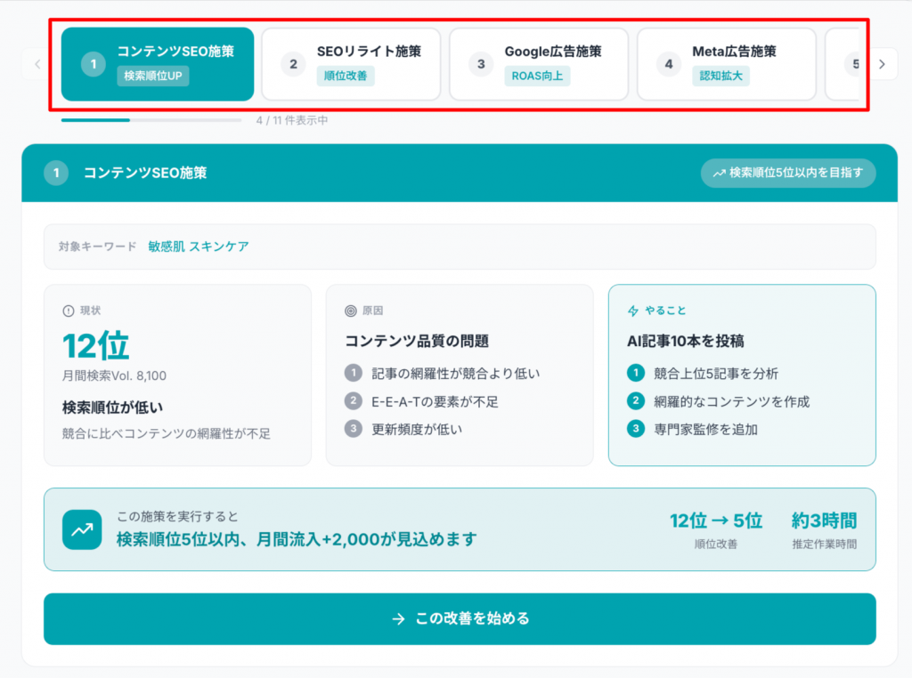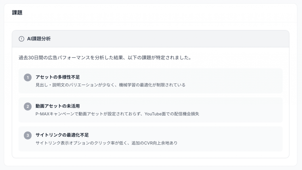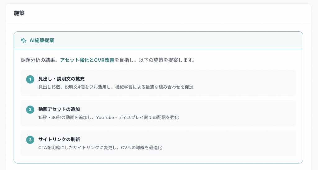 まずは、AIが提示する最新データに基づいた提案内容をチェックします。自社では気づきにくい改善のヒントが表示されている可能性があります。