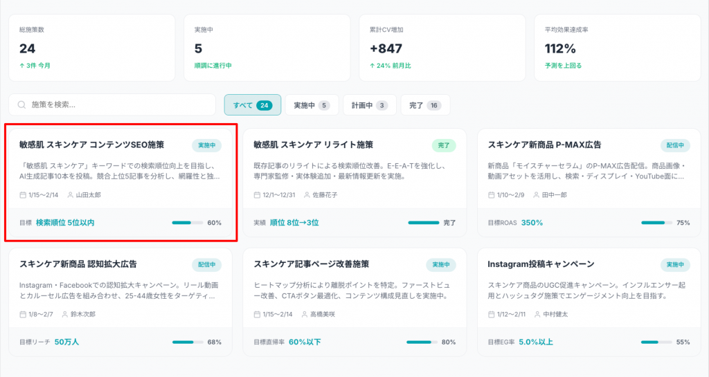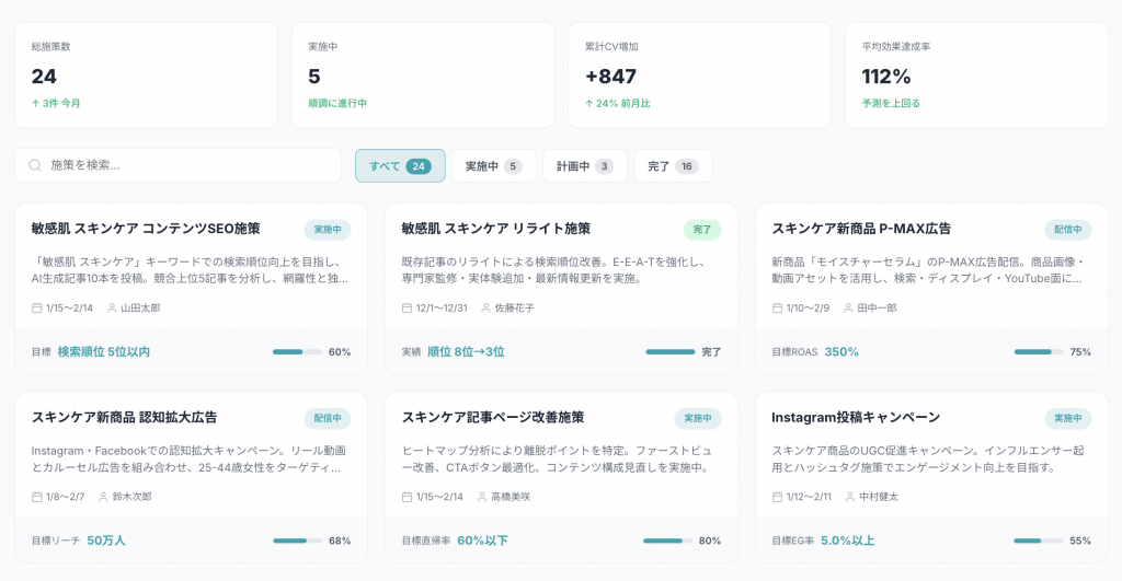 - 実施中の施策:採用した施策の進捗状況を管理します。ステータスを更新することで、チーム内での共有や効果測定が可能になります。