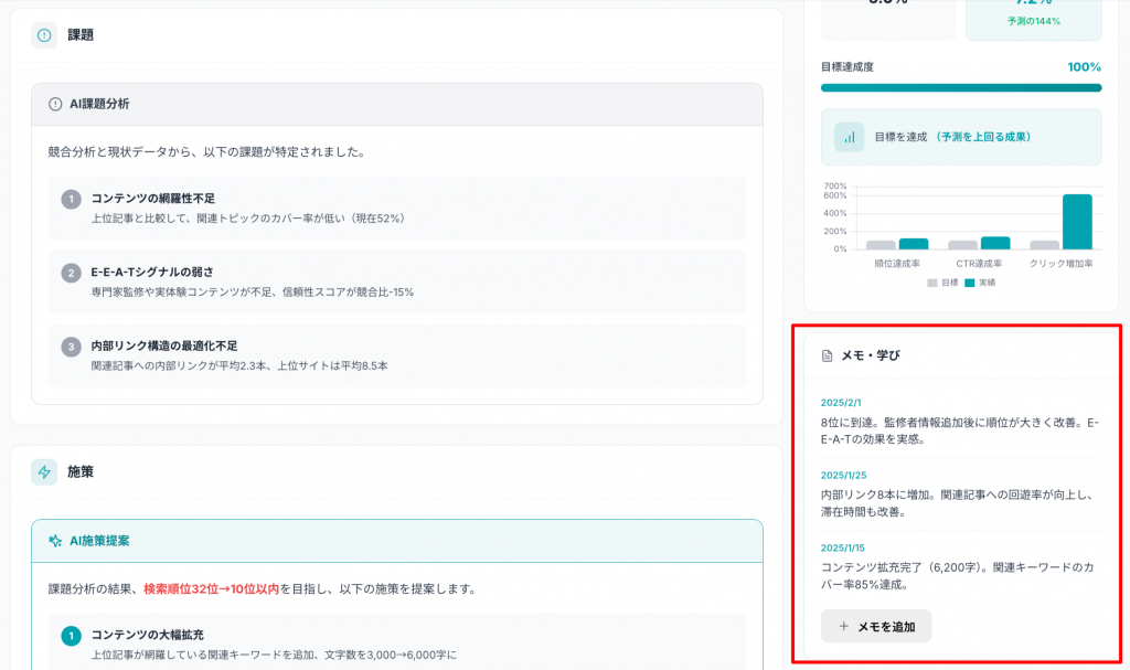 「メモ・学び」では、効果測定中の気づきや実行内容詳細を記録できます。「+ メモを追加」を押すと入力欄が表示されますので、記録用にご活用ください。