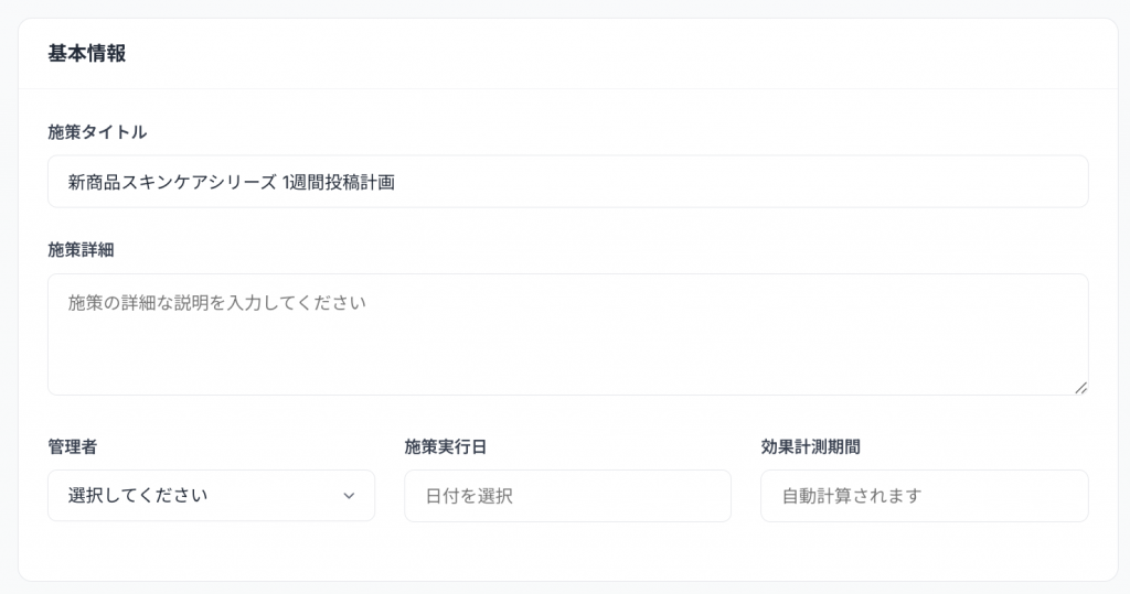 - 施策実行日:施策を実行した日を記録できます。施策実行日を記入すると記入後からAIが施策実行による数字の変動を測定し始めます。