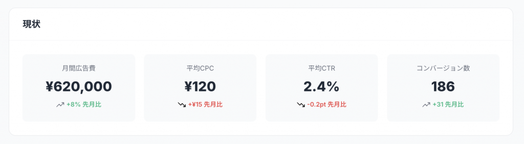 例えば、添付では、月間広告費が620,000円、平均CPC(広告1クリックあたりのコスト)が120円、平均CTR(広告のクリック率)が2.4%、コンバージョン数(購入やお問い合わせなど)が186件であることが分かります。