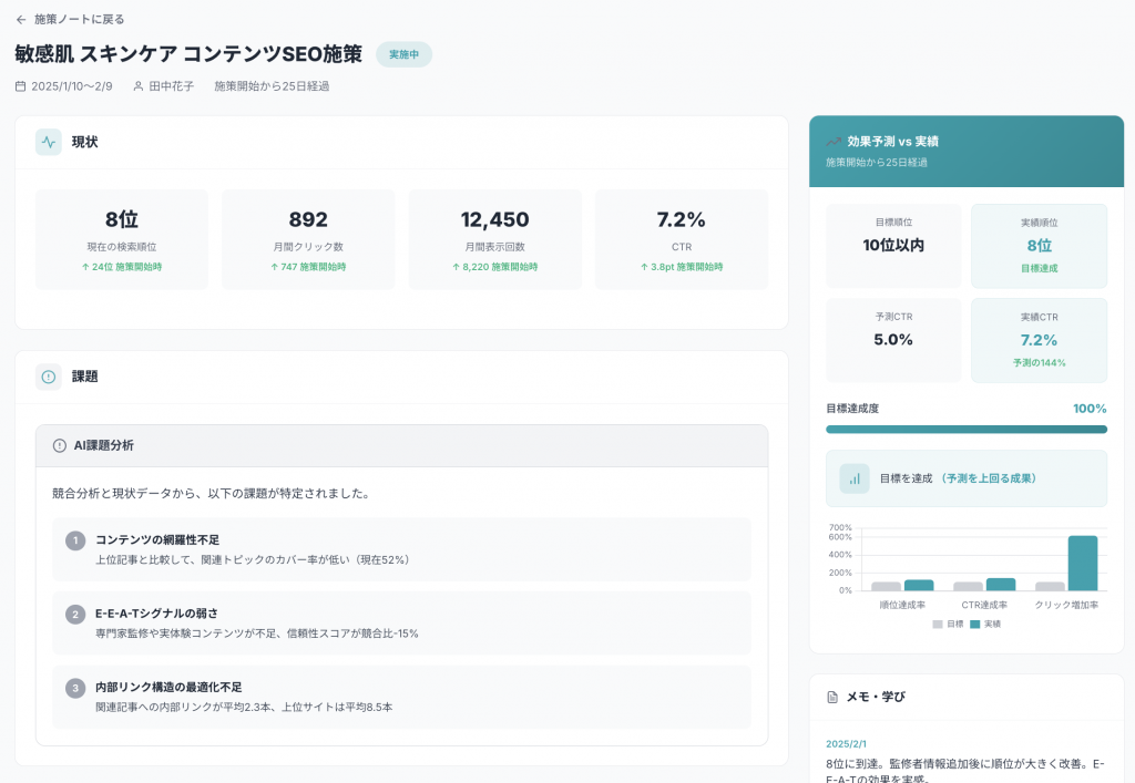画面右側に表示されている「効果予測 vs 実績」では、施策提案時に予測していた数字と実際の現状数値を比較することができ、目標の達成度を確認できます。予測を上回る成果が出ている場合は、100%と表示されます。