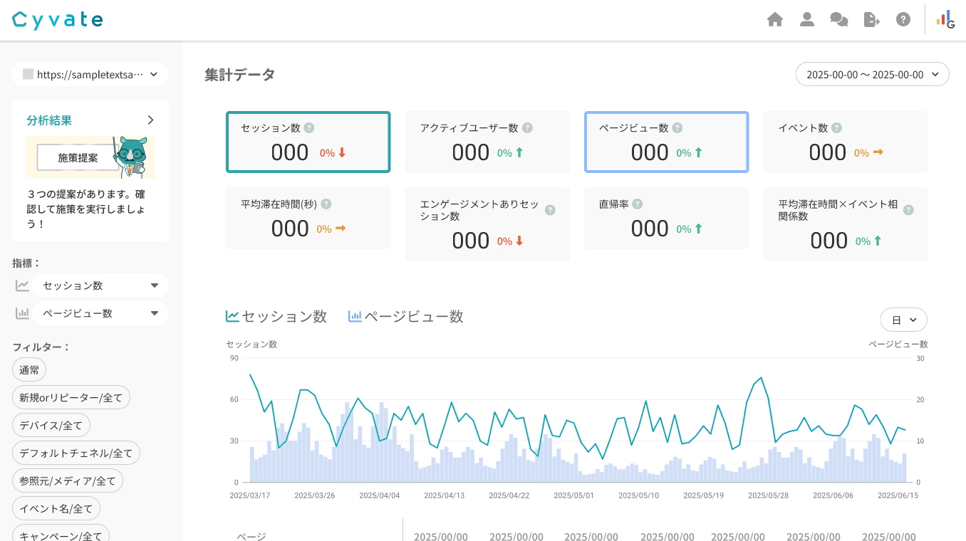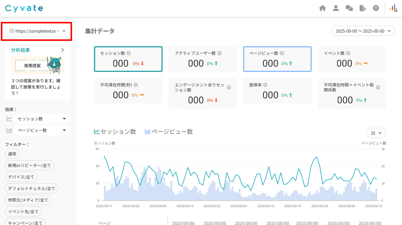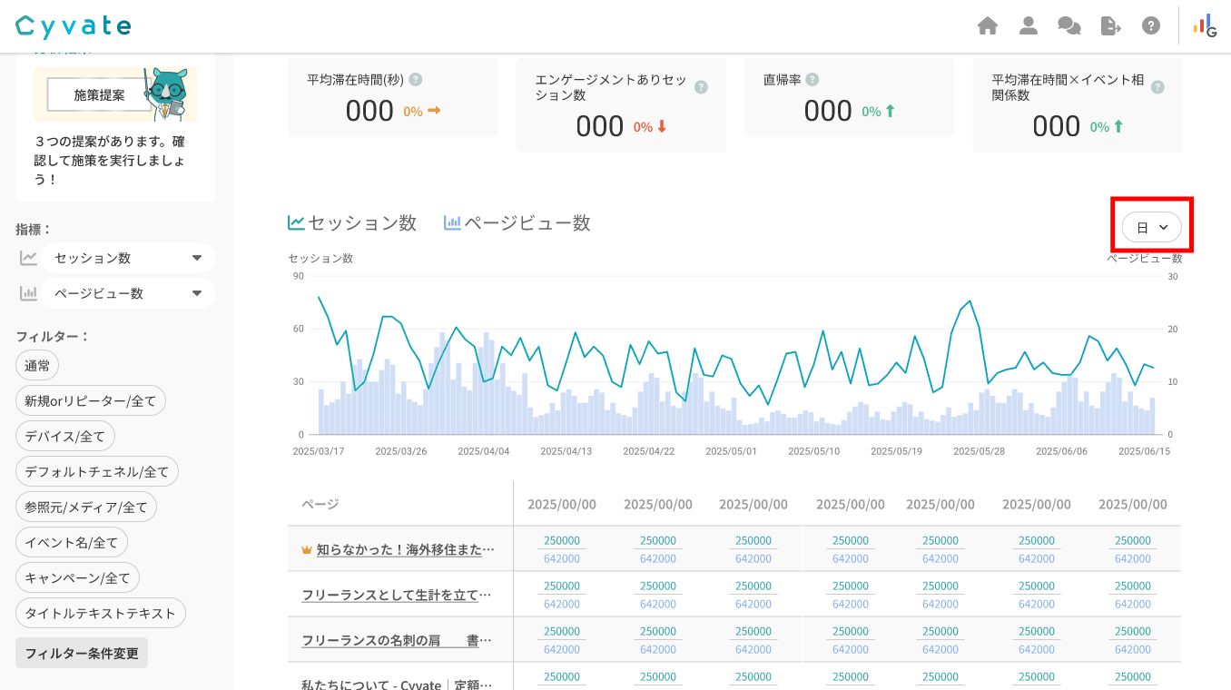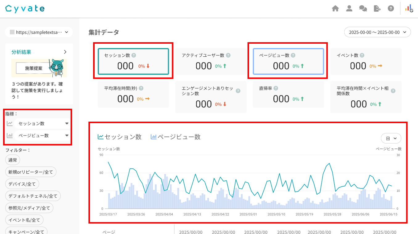 サイドバーの指標をクリックすると集計データ上部のカードも選択され、グラフに表示される指標もその値に応じて表示されます。
