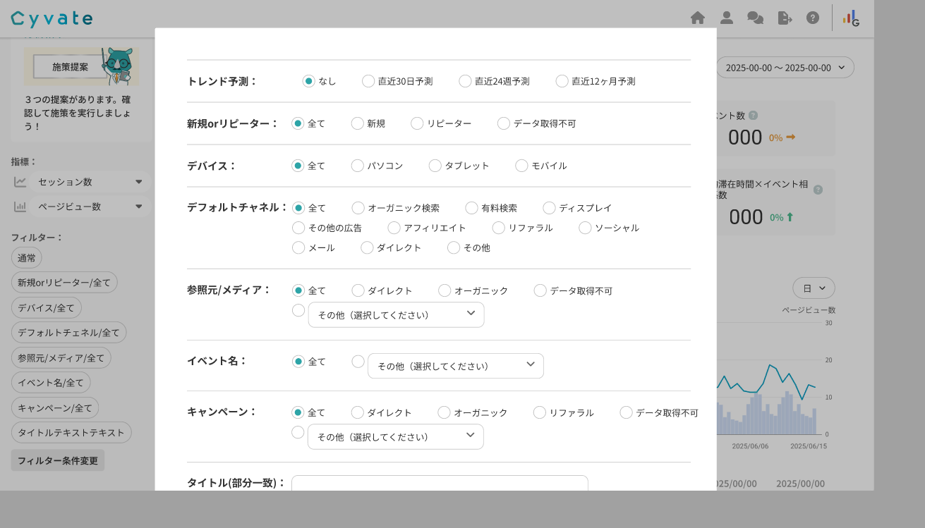 - トレンド予測:過去のアクセスデータをもとに今後のセッション数や売上などの変動をAIが予測した値。