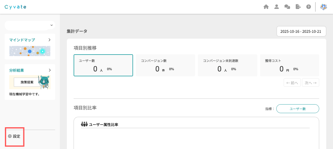 ④「集計データ」に表示が切り替わったら左下メニューの「設定」をクリックしてください。