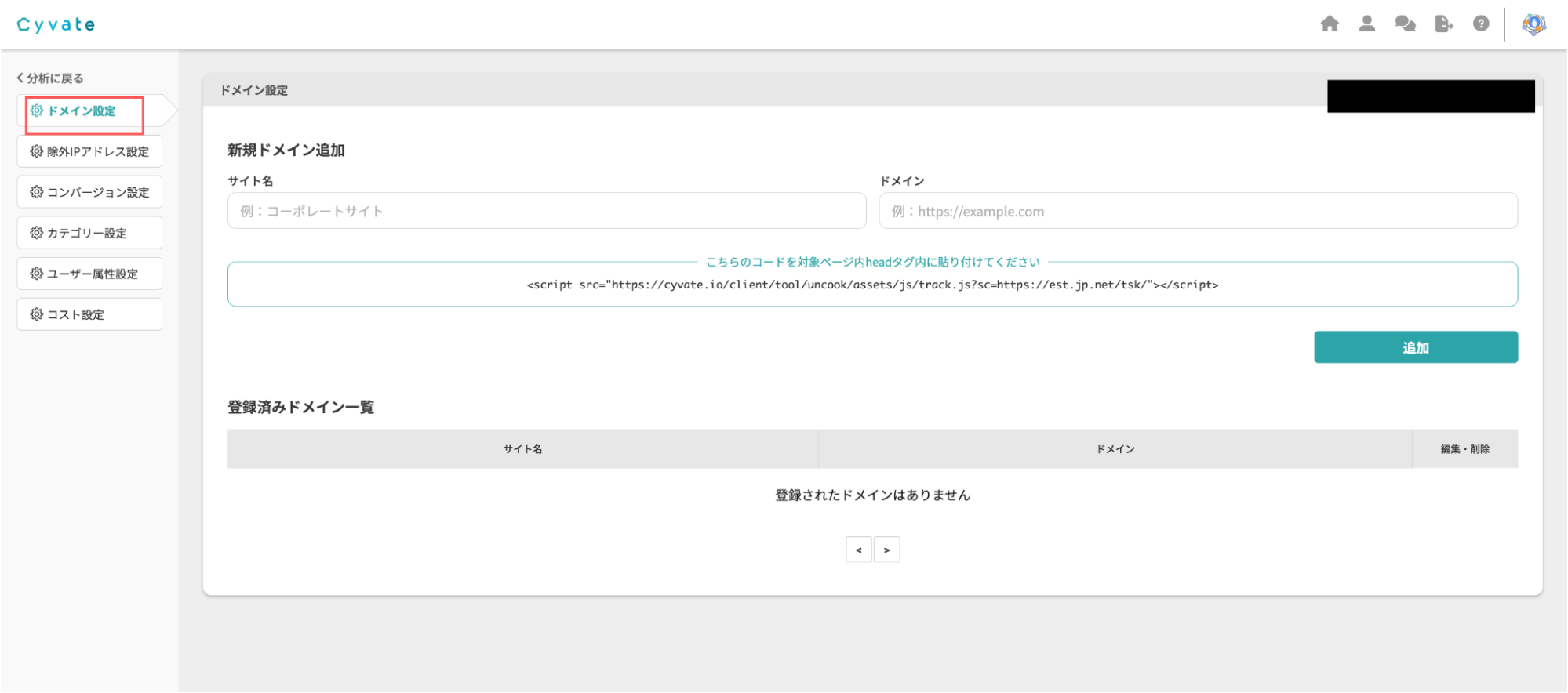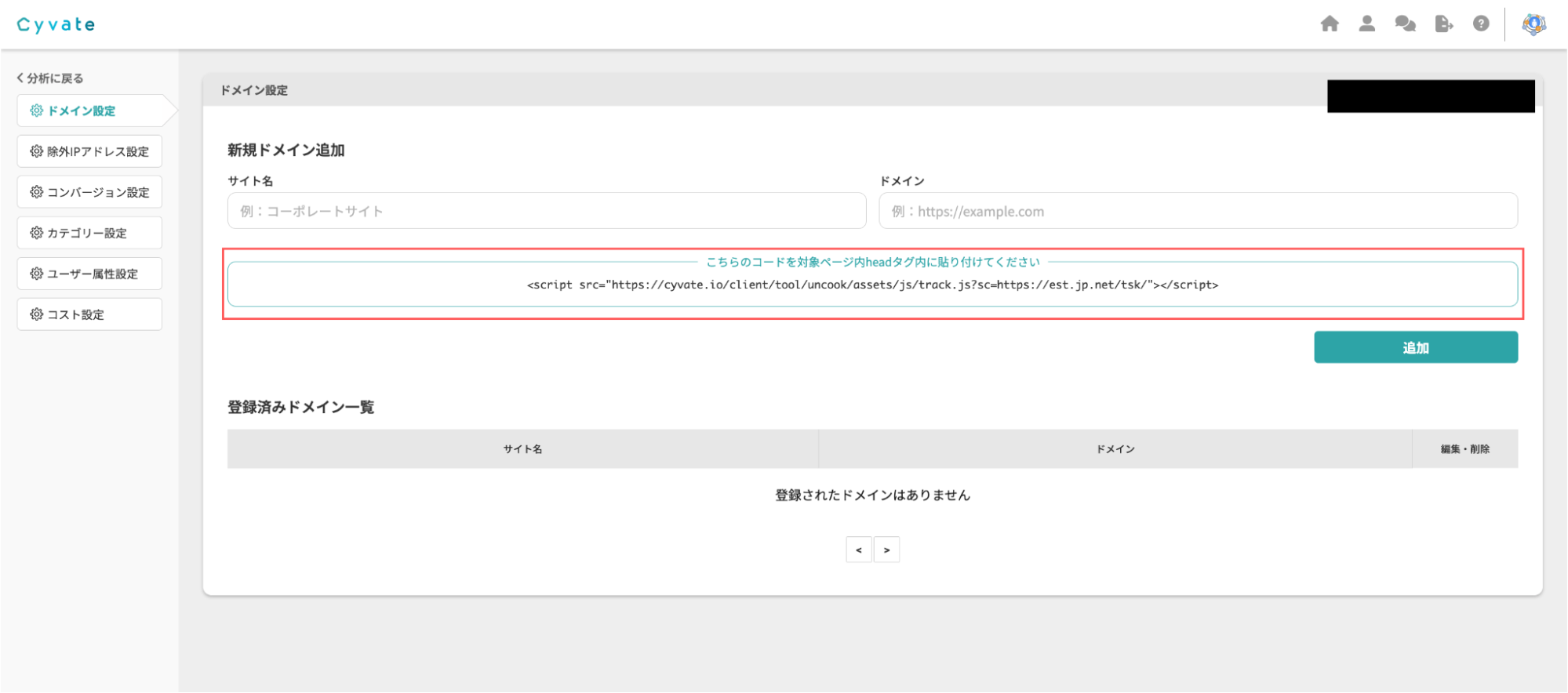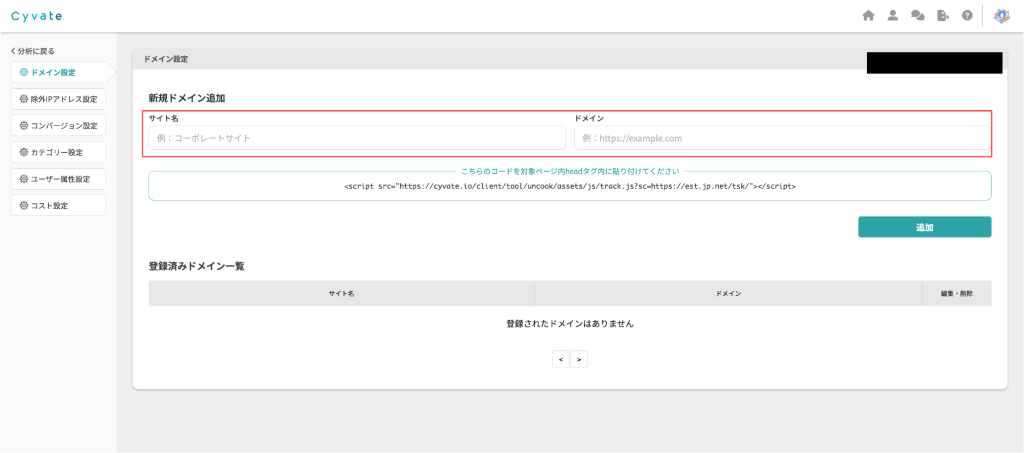 「サイト名」の入力と「ドメイン」に計測したいサイトのドメインを入力し「更新」をクリックしてください。