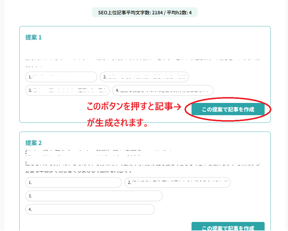 そこから1つ記事を選んでいただき、「この提案で記事を作成」を選択すると、記事生成が始まります。