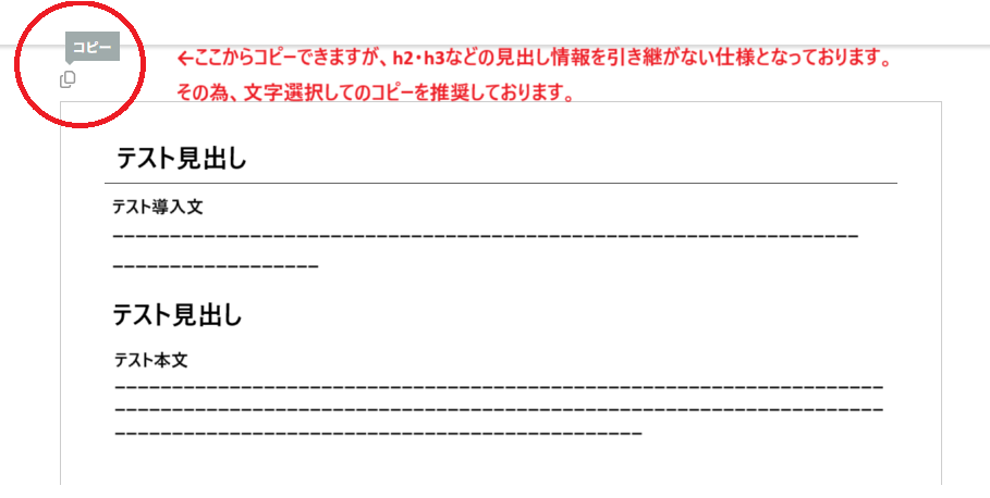 ※画面左上にコピーがありますが、h2・h3などの見出し情報を引き継がない仕様となっております。