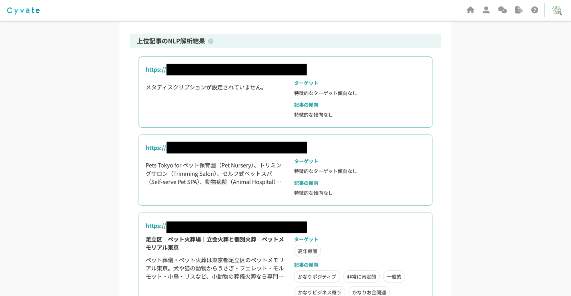 上位記事のNLP解析結果についての表示もございます。こちらでは競合の記事についての情報が表示されます。URLやターゲット、記事傾向について確認できます。