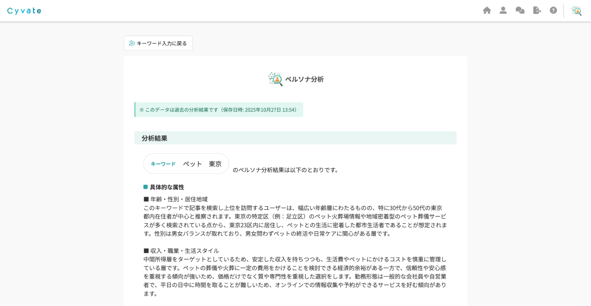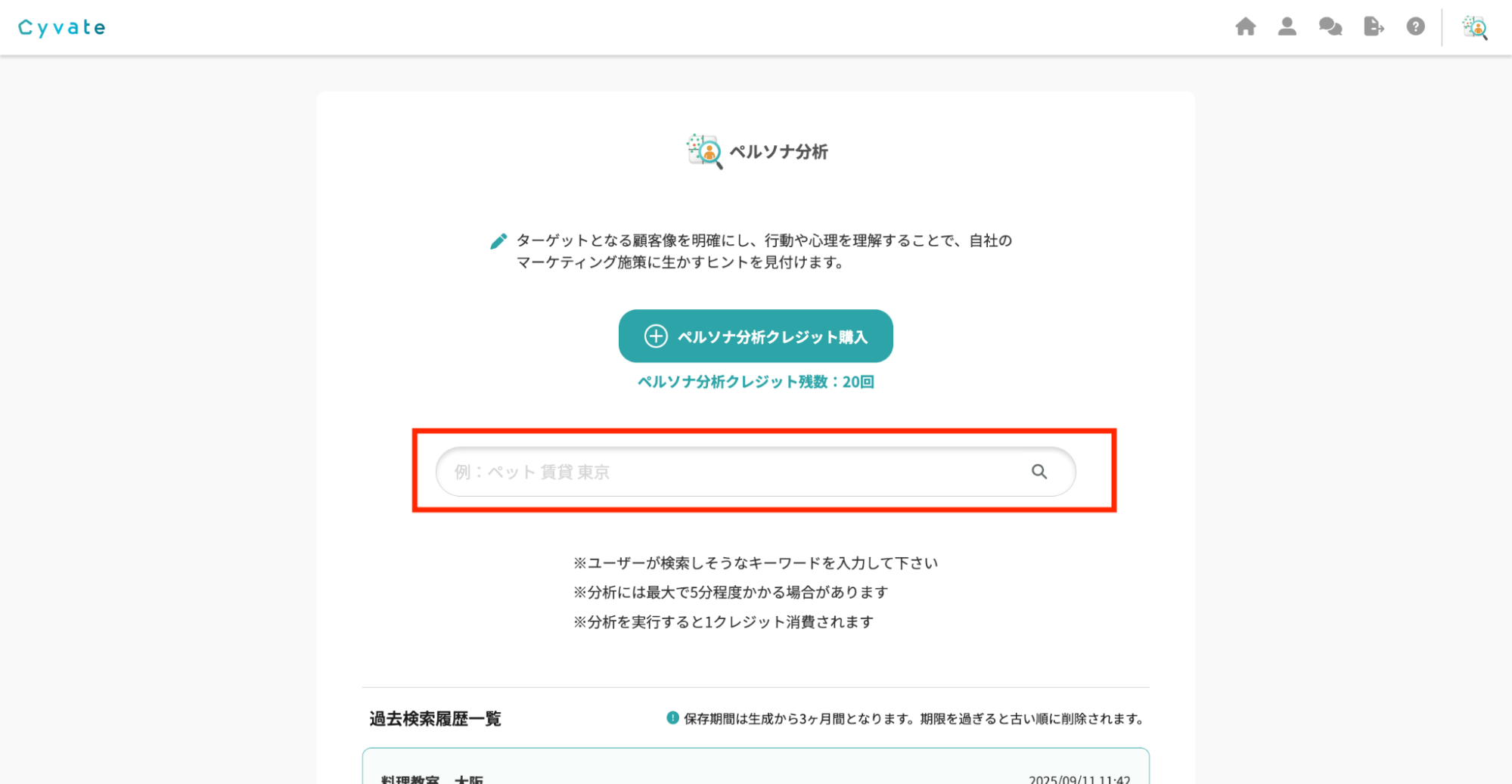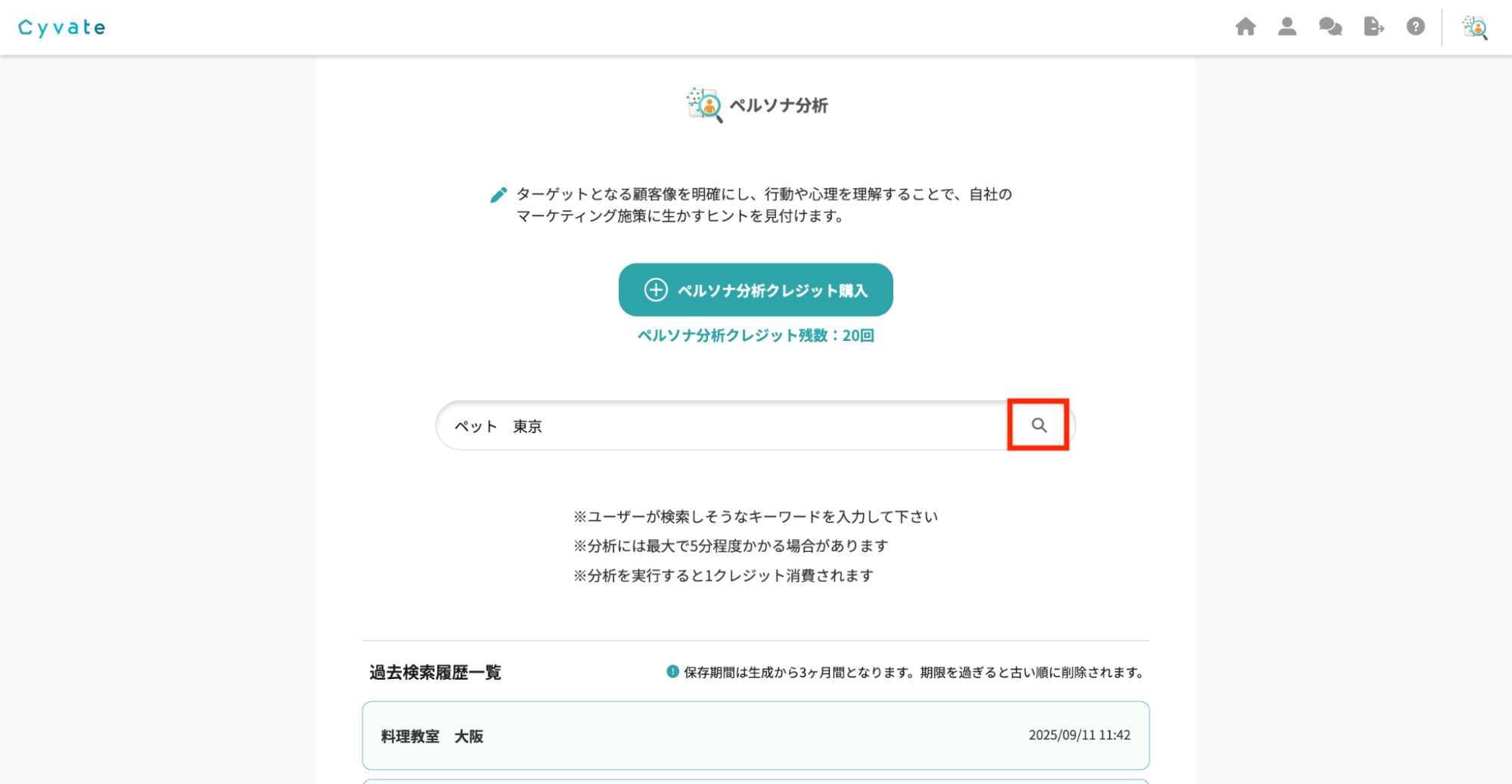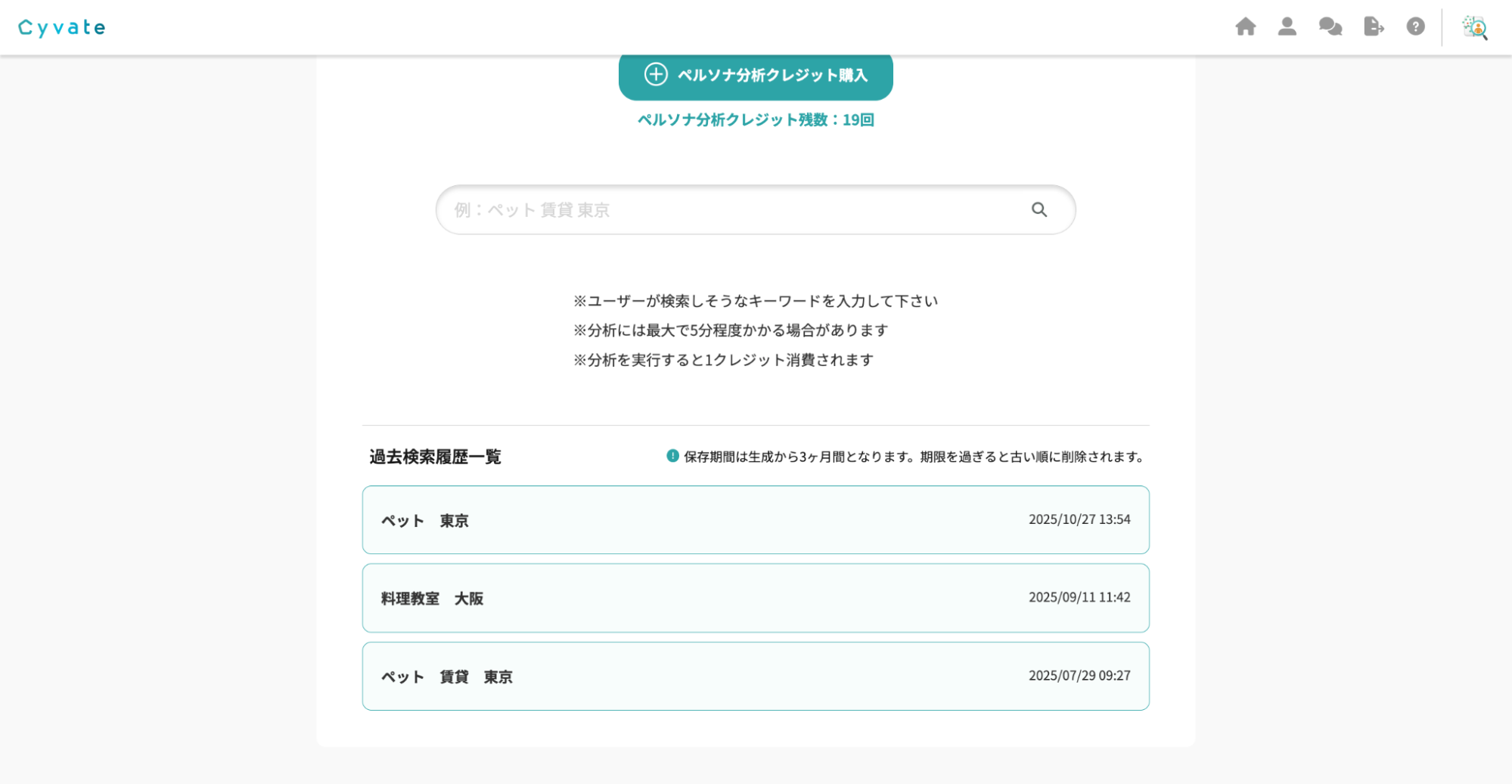 ⑧分析結果は一定期間ペルソナ分析画面で履歴に残ります。3ヶ月後に履歴は削除されますので、長期保存ご希望の際は、ご自身のメモをご活用ください。