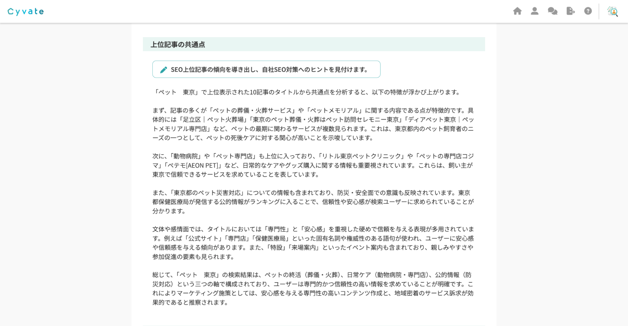 上位記事の共通点では、キーワードに対して競合となる記事の傾向を書き出しているので自社SEO対策へのヒントとしてご活用いただけます。