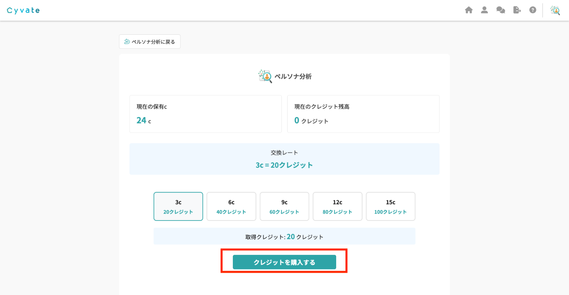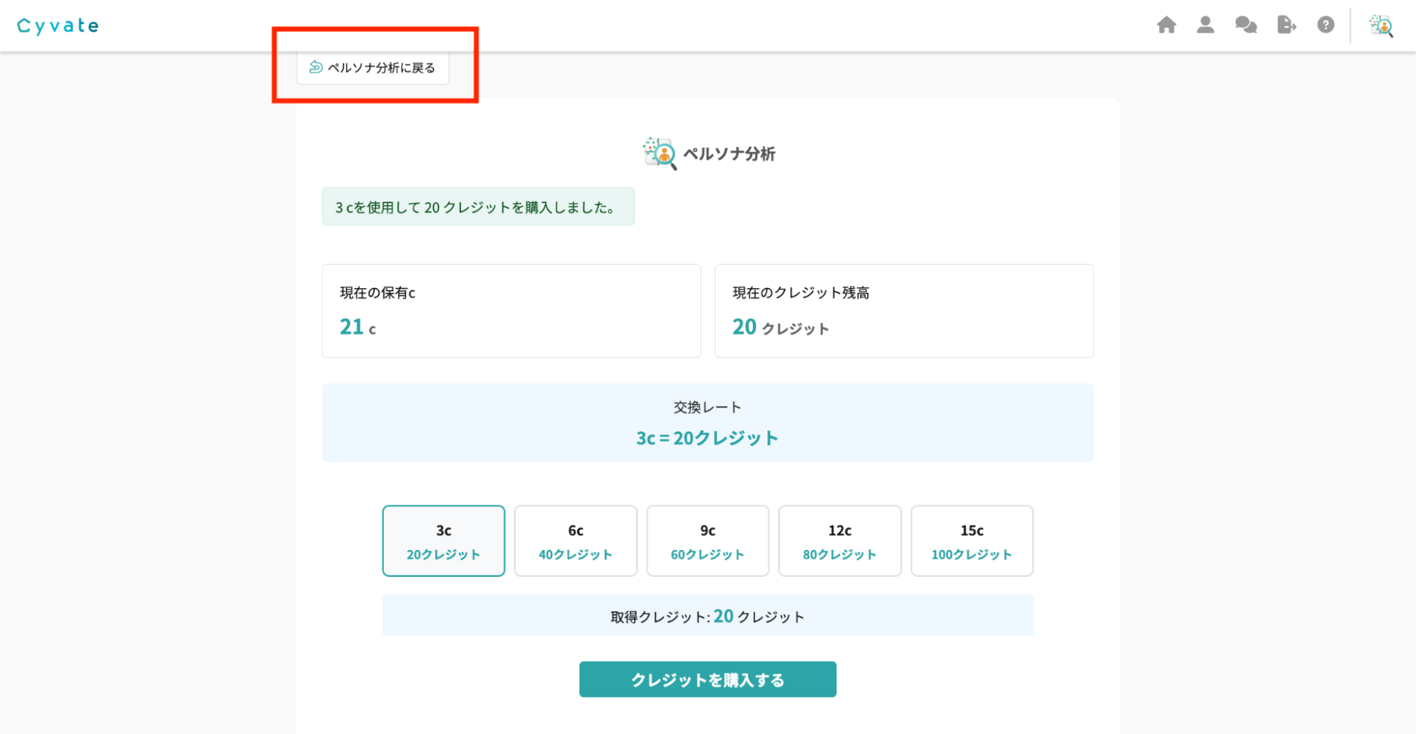 ④クレジットが付与されたことを確認したら[ペルソナ分析に戻る]をクリックしてください。
