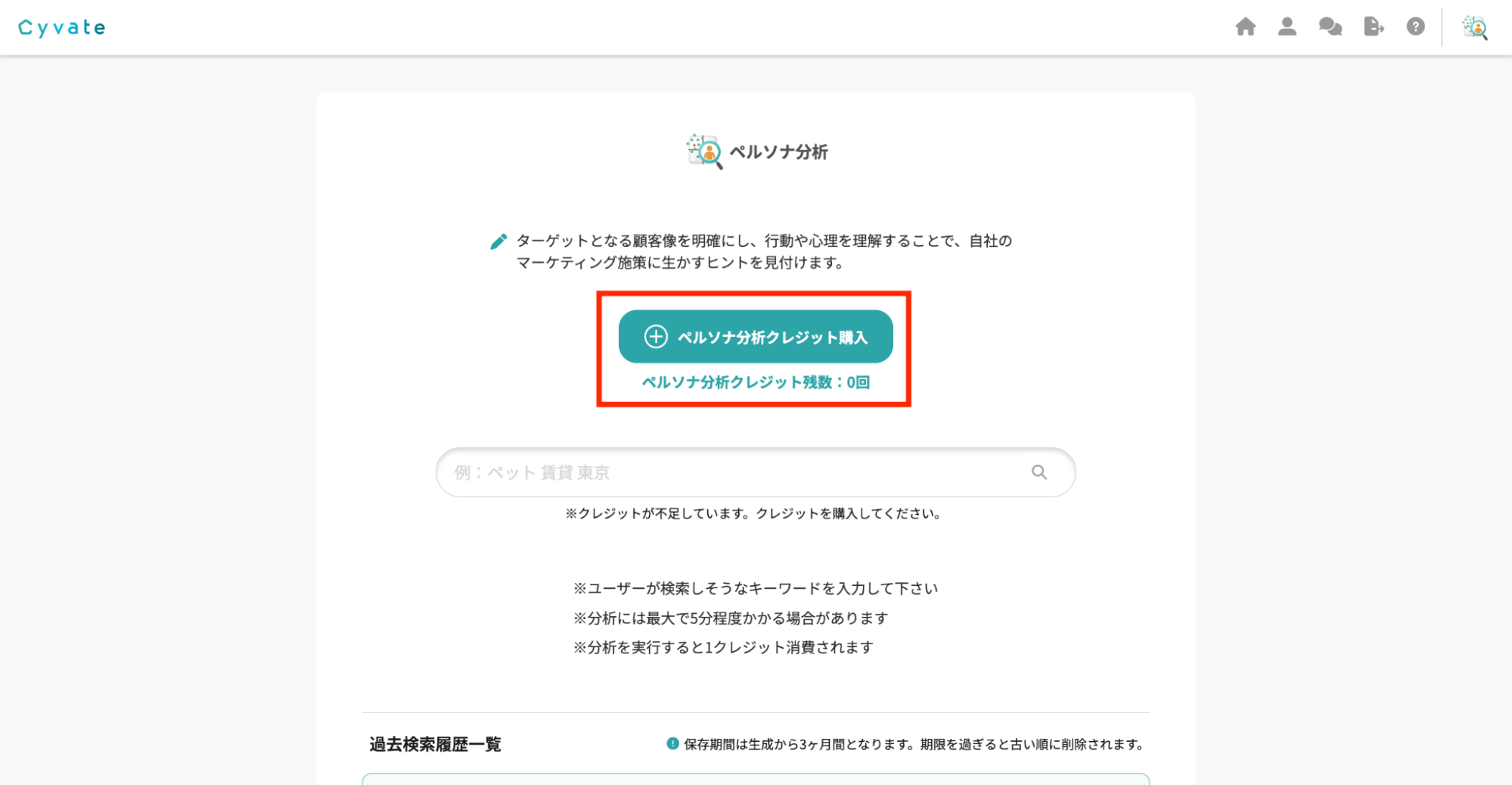 ②クレジットが『0』の場合は[ペルソナ分析クレジット購入]をクリックしてください。